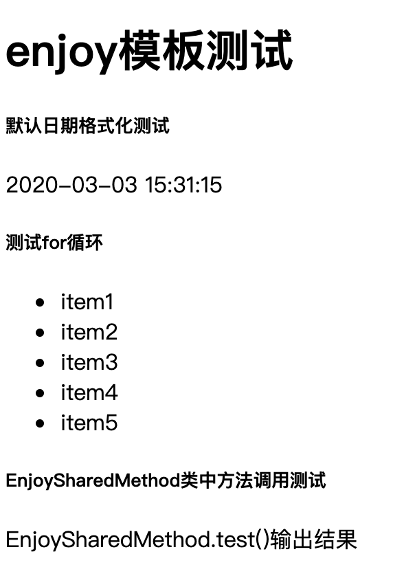 解释一下在EnjoyConfig配置中的EnjoySharedMethod类的作用,这个类的作用是用来存放一些对在视图显示上的一些扩展方法,在模板文件上就可以很简单的直接调用这个类中的方法来达到扩展的目的。我这里演示使用只是简单的放了一个test方法,EnjoySharedMethod类的代码如下: