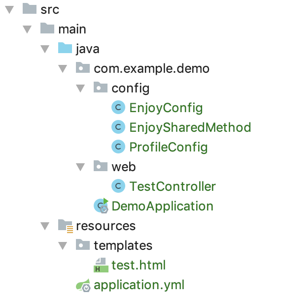 上述配置中注释都写的很详细,这里我增加了一个ProfileConfig类,用来读取yml配置文件中的spring.profiles.active的值,作用就是用来区分生产环境还是开发环境,在开发环境下会开启enjoy的开发模式,在enjoy的开发模式下,html模板文件修改了,前端视图上就会立刻生效,不需要重启。(注:因为这里enjoy检测的是编译后的文件变动,所以需要SpringBoot启用热加载,否则就算enjoy开启了开发模式,html修改了前端也不会生效。附:SpringBoot中enjoy模板引擎与devtools冲突解决办法)
