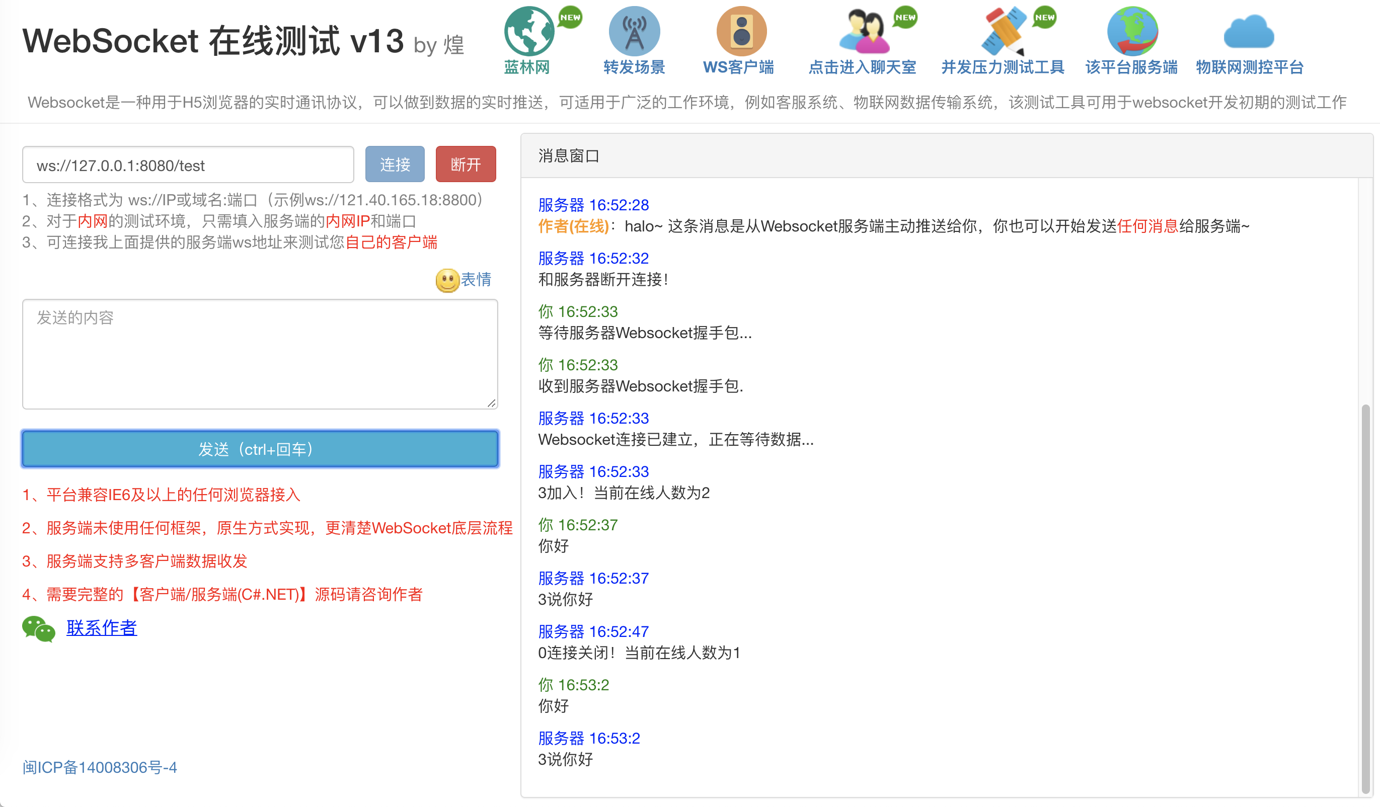 测试效果(上述样例中WebSocket的连接地址为:ws://127.0.0.1:8080/test 跟正常的web请求地址基本类似,只是开头的http换成了ws)
