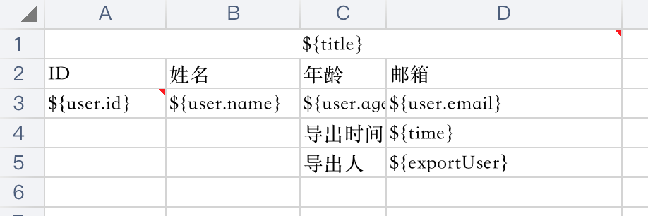 我在这里为了演示比较自由的定制化表格样式,我在右下角添加了一个导出时间和导出人。简单的是用${}标记进行输出。