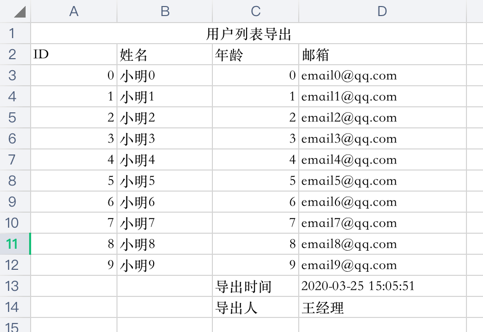 到这我们需要导出的excel文件已经生成完毕了,除JxlsHelper这行是用于生成excel文件以外,其余代码都是为了实现文件下载的功能,具体可以参考:SpringBoot如何实现文件下载功能。看一下最终导出的excel文件: