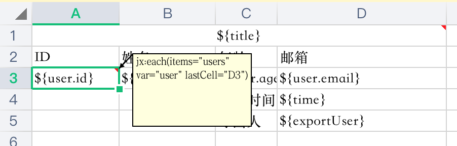 在A3单元格的位置也有一个批注,因为第3行这一行是需要进行遍历list进而填充数据的。遍历数据的批注为:jx:each(items="users" var="user" lastCell="D3")意思是遍历users这个list,跟java中的for语句基本类似。lastCell的值就是该行的覆盖范围是覆盖到D3单元格。