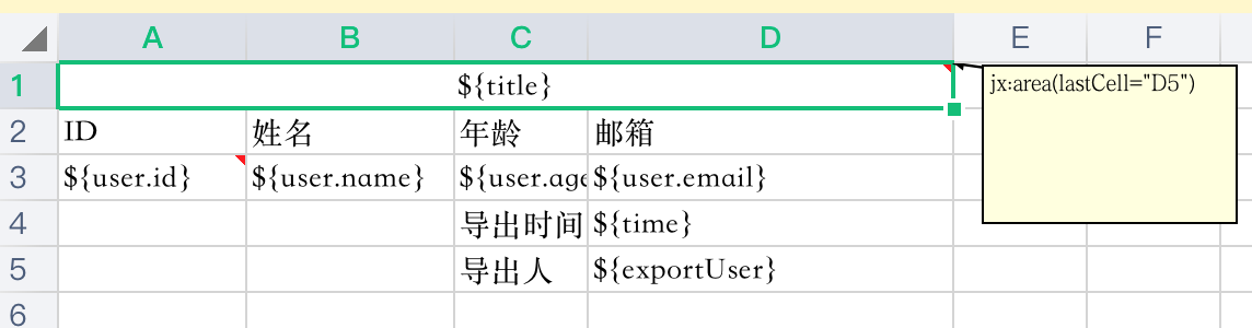 excel模板的第一个单元格A1是固定要写批注的。批注内容为:jx:area(lastCell="D5")意思是模板定义的覆盖范围为A1-D5,在这个覆盖范围内的标记会被jxls去解析填充对应的数据。
