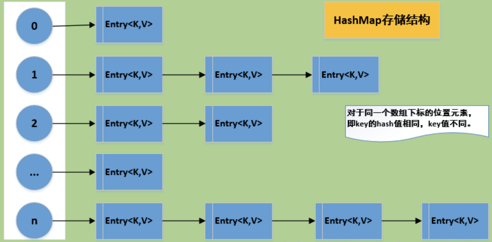 (4)由于不同的key值可能具有相同的hash值,即一个数组的某个位置出现两个相同的元素,对于这种情况,HashMap采用链表的形式进行存储。即使用链地址法来解决冲突问题。
