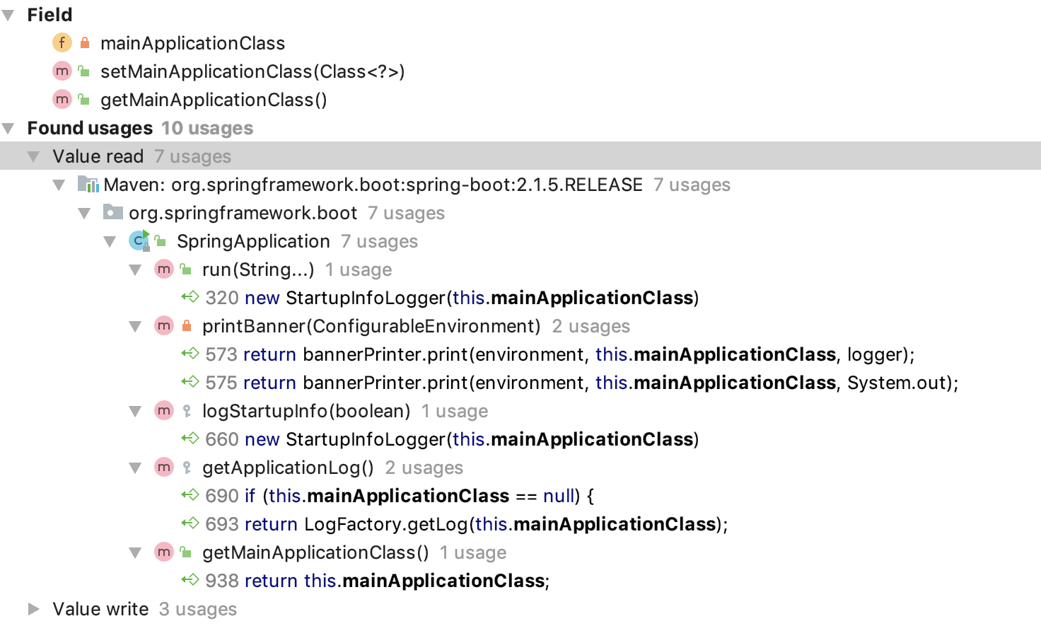 SpringBoot将deduceMainApplicationClass方法推断出来的类赋值给了this.mainApplicationClass。通过idea的Find Usages查看属性的使用情况,发现只是在banner打印或者log上有涉及,好像没发现有很大的重要性。