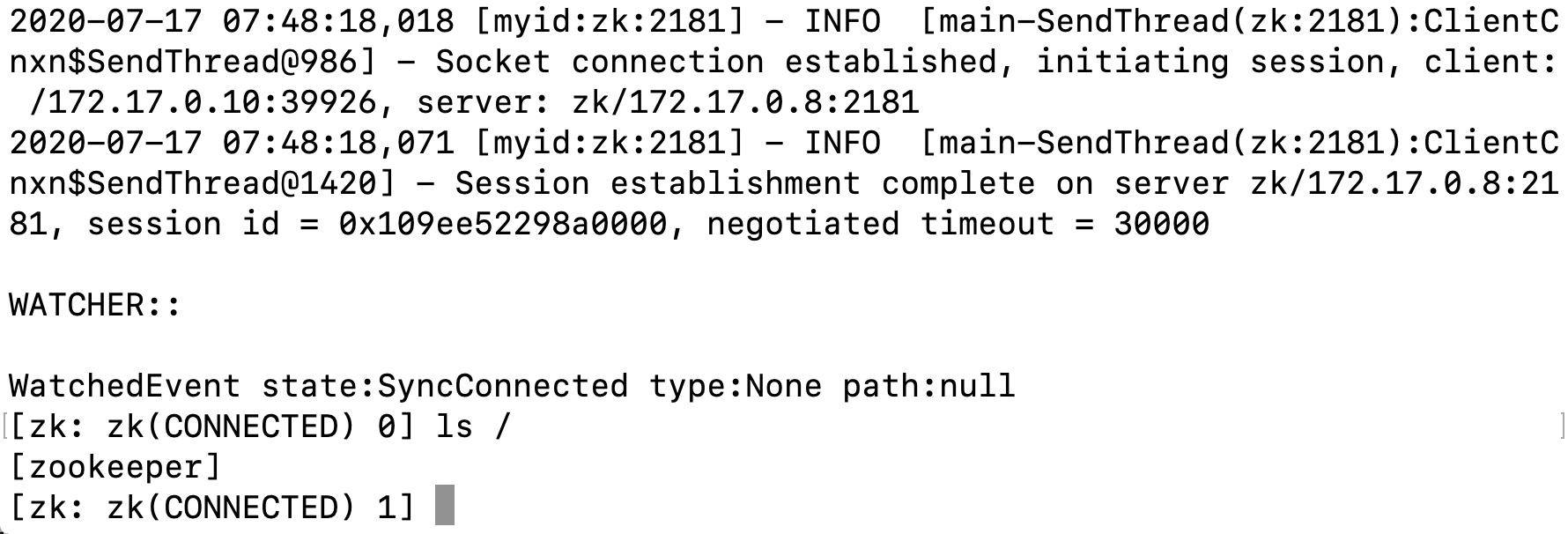 注意命令中的zk标识,这里需要跟我们开头创建zk容器时的--name后面的名字一致,否则会连接不上,这里涉及了docker之间的网络连接相关知识,具体可以百度了解一下。