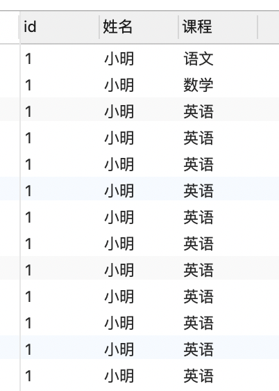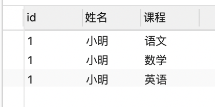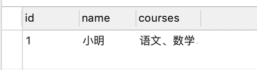 INSERT INTO `test`.`t_student`(`id`, `name`, `courses`) VALUES (1, '小明', '语文、数学、英语');