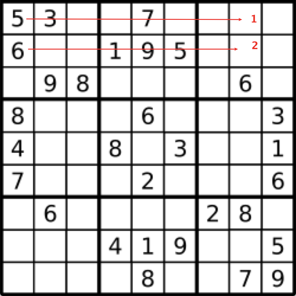 char[][] board = new char[][]{{'5', '3', '.', '.', '7', '.', '.', '.', '.'}, {'6', '.', '.', '1', '9', '5', '.', '.', '.'}, {'.', '9', '8', '.', '.', '.', '.', '6', '.'}, {'8', '.', '.', '.', '6', '.', '.', '.', '3'}, {'4', '.', '.', '8', '.', '3', '.', '.', '1'}, {'7', '.', '.', '.', '2', '.', '.', '.', '6'}, {'.', '6', '.', '.', '.', '.', '2', '8', '.'}, {'.', '.', '.', '4', '1', '9', '.', '.', '5'}, {'.', '.', '.', '.', '8', '.', '.', '7', '9'}};