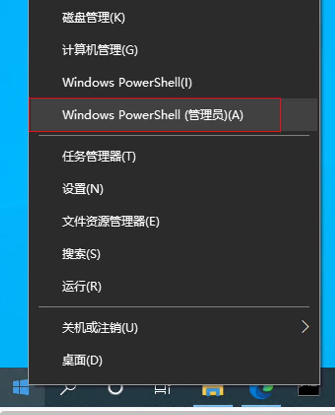 右键点击开始按钮>Windows PowerShell(管理员)。