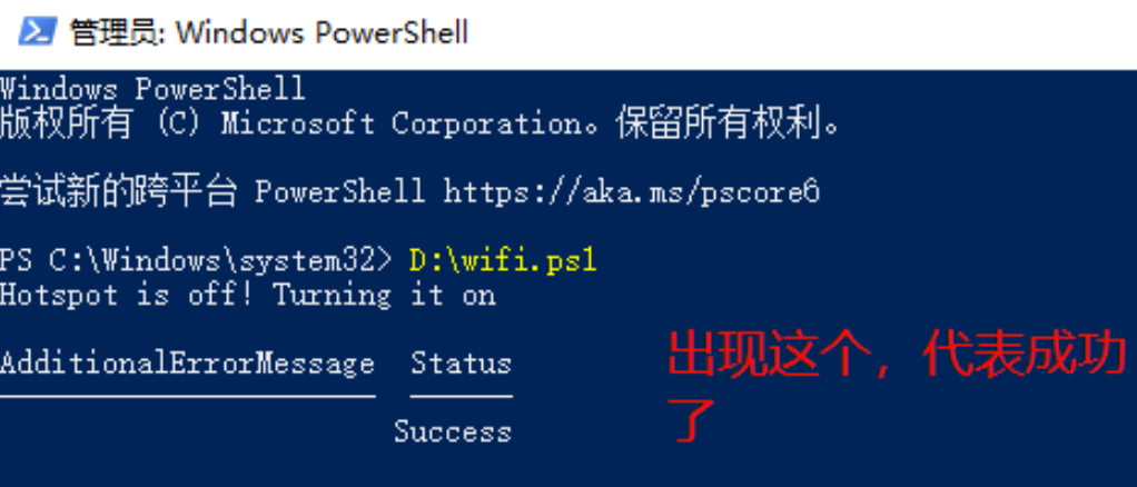 测试:可以在PowerShell中运行一下wifi.ps1脚本看下是否正常(测试前记得手动在windows界面上把热点关掉再试)