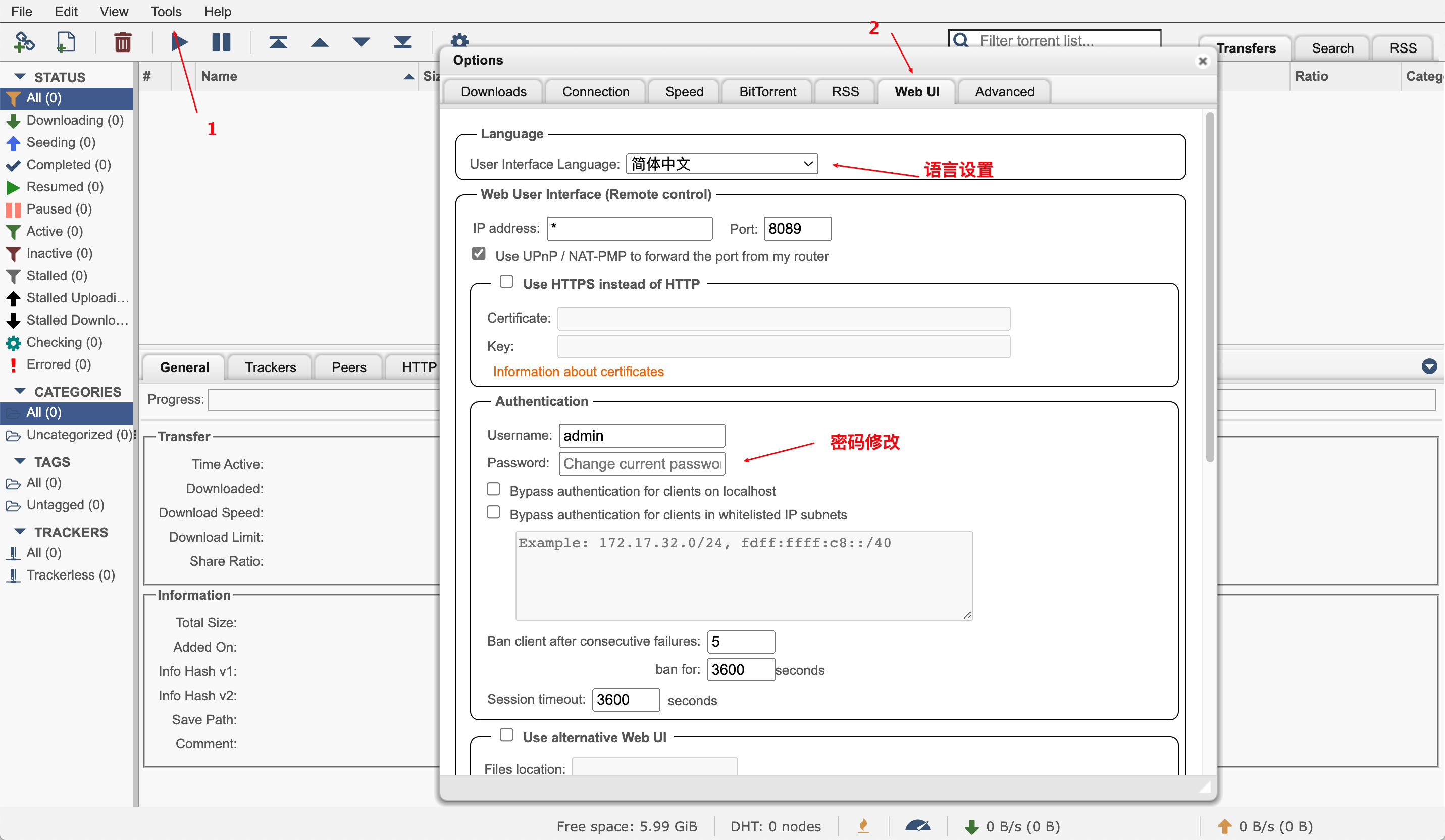 命令执行完毕后,qbittorrent就安装好了,打开http://localhost:18080 即可看到管理界面。