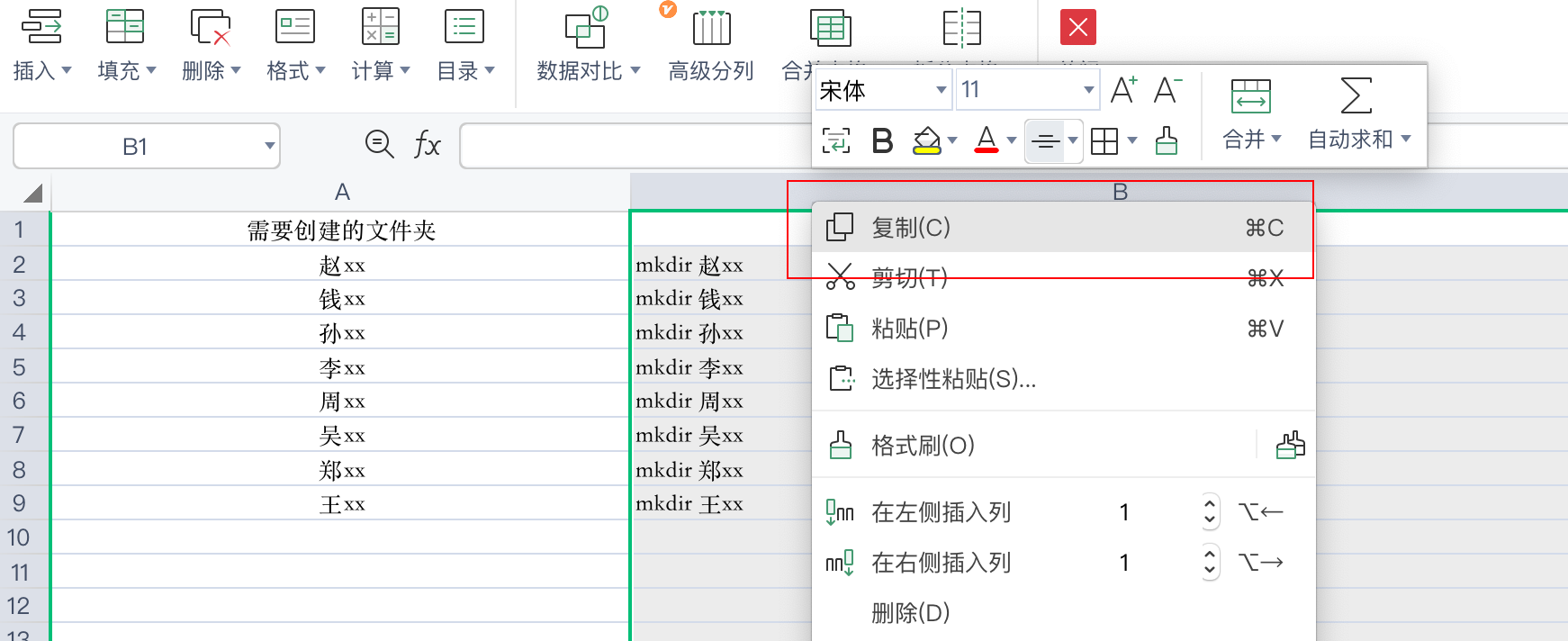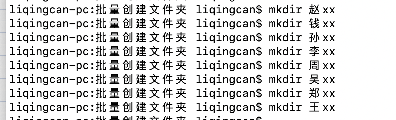 可以看出我们所有文件夹的创建命令已经通过excel生成好了