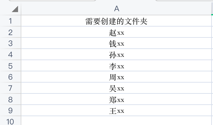 1、新建一个excel文件,在A列上,每一行作为一个文件夹名,进行需要创建的文件夹的定义(实际情况正常这个数据应该已经有了,可以跳过)