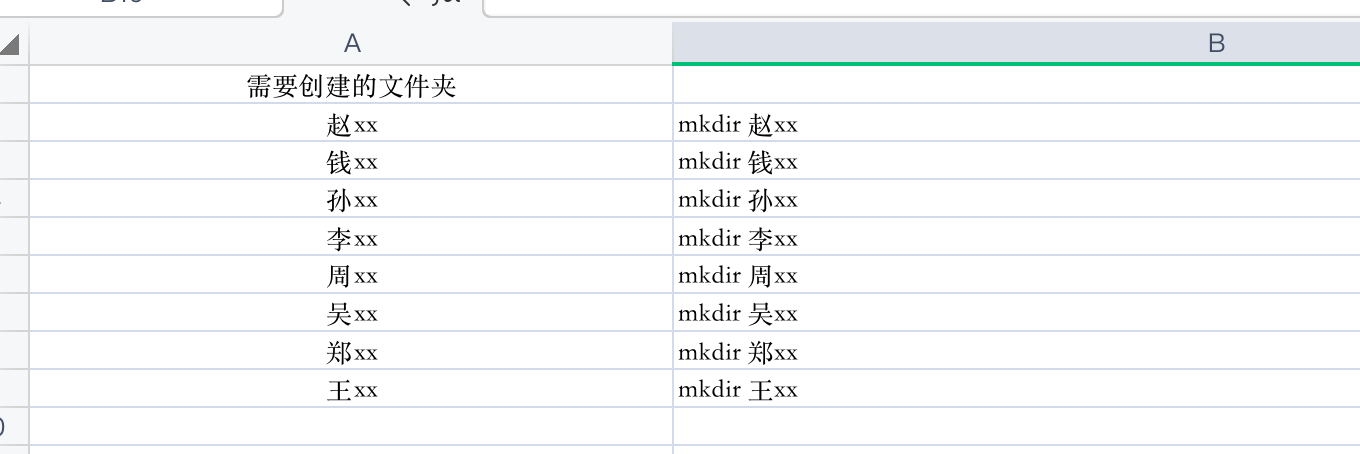 2、在B列上,需要创建的第一个文件夹所在单元格后的单元格,对照上述样例也就是B2单元格,输入如下命令: