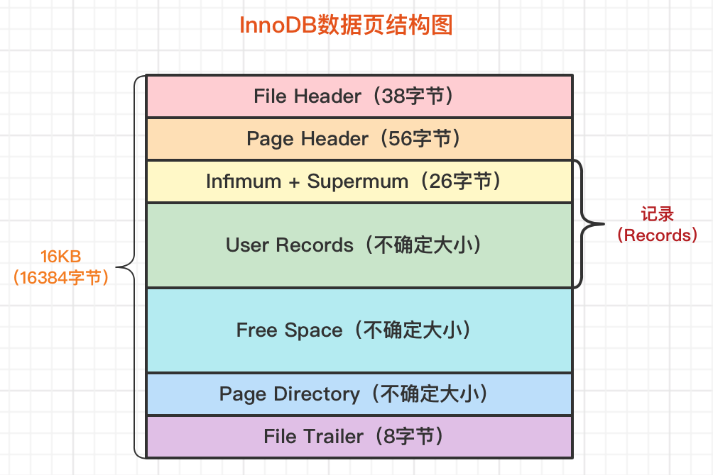 申请新的数据页->此时并没有User Records这个部分,当我们插入一条记录时会从Free Space也就是尚未使用的存储空间中申请一个记录大小的空间划分到User Records中用于记录的存储->当Free Space部分的空间全部被User Records部分替代掉之后,也就意味着这个页使用完了->继续有新的记录插入->重新申请新的页了