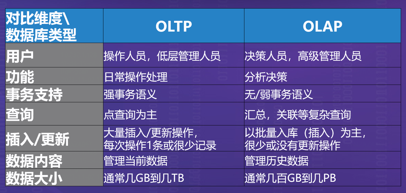 数据库OLTP和OLAP业务特征对比图
