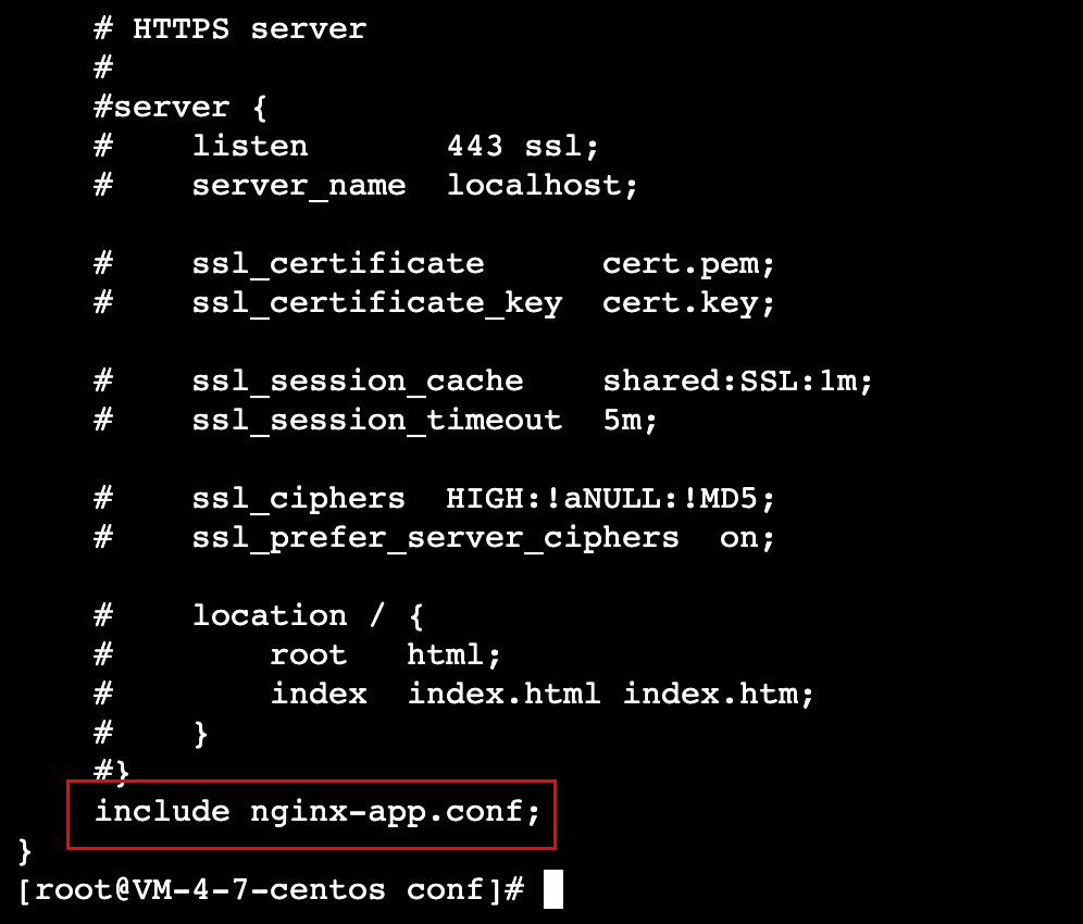 打开nginx.conf文件,通过include的形式将nginx-app.conf配置引入。在最后一个}前添加include nginx-app.conf;