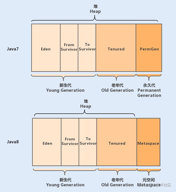 在Java6版本中,永久代在非堆内存区;到了Java7版本,永久代的静态变量和运行时常量池被合并到了堆中;而到了Java8,永久代被元空间(处于本地内存)取代了。