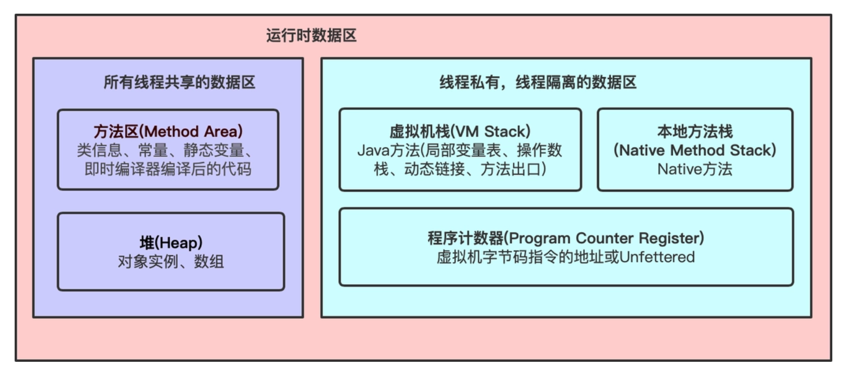 如图所示,JVM的内存模型共分为5个区:堆(Heap)、方法区(Method Area)、程序计数器(Program Counter Register)、虚拟机栈(VM Stack)、本地方法栈(Native Method Stack)。