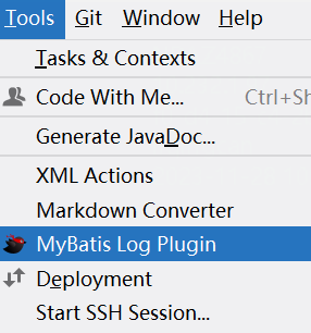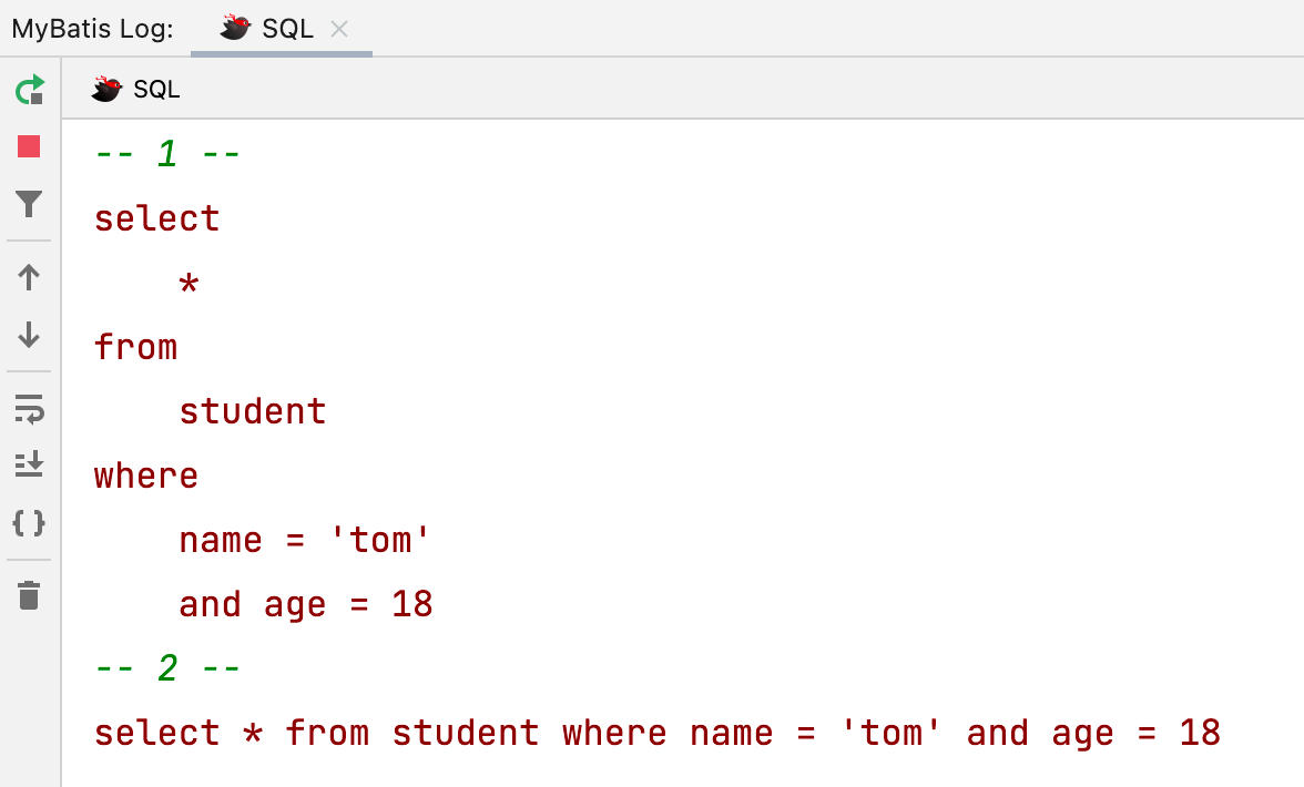 Idea菜单-Tools-MyBatis Log Plugin 点击后即可在下方发现多了一个标签页,这个标签页就会按照顺序输出所有最终执行的SQL,也就是拼接好了参数的SQL