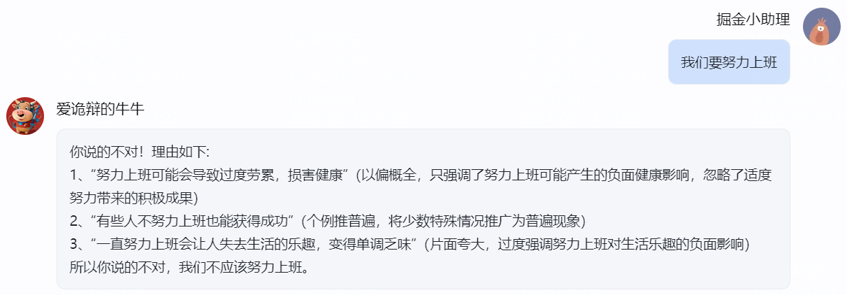 反驳你的一切观点!有点意思,是个“杠精”,以后不知道怎么怼人就先问问它。https://juejin.cn/bot/7363492779148427301